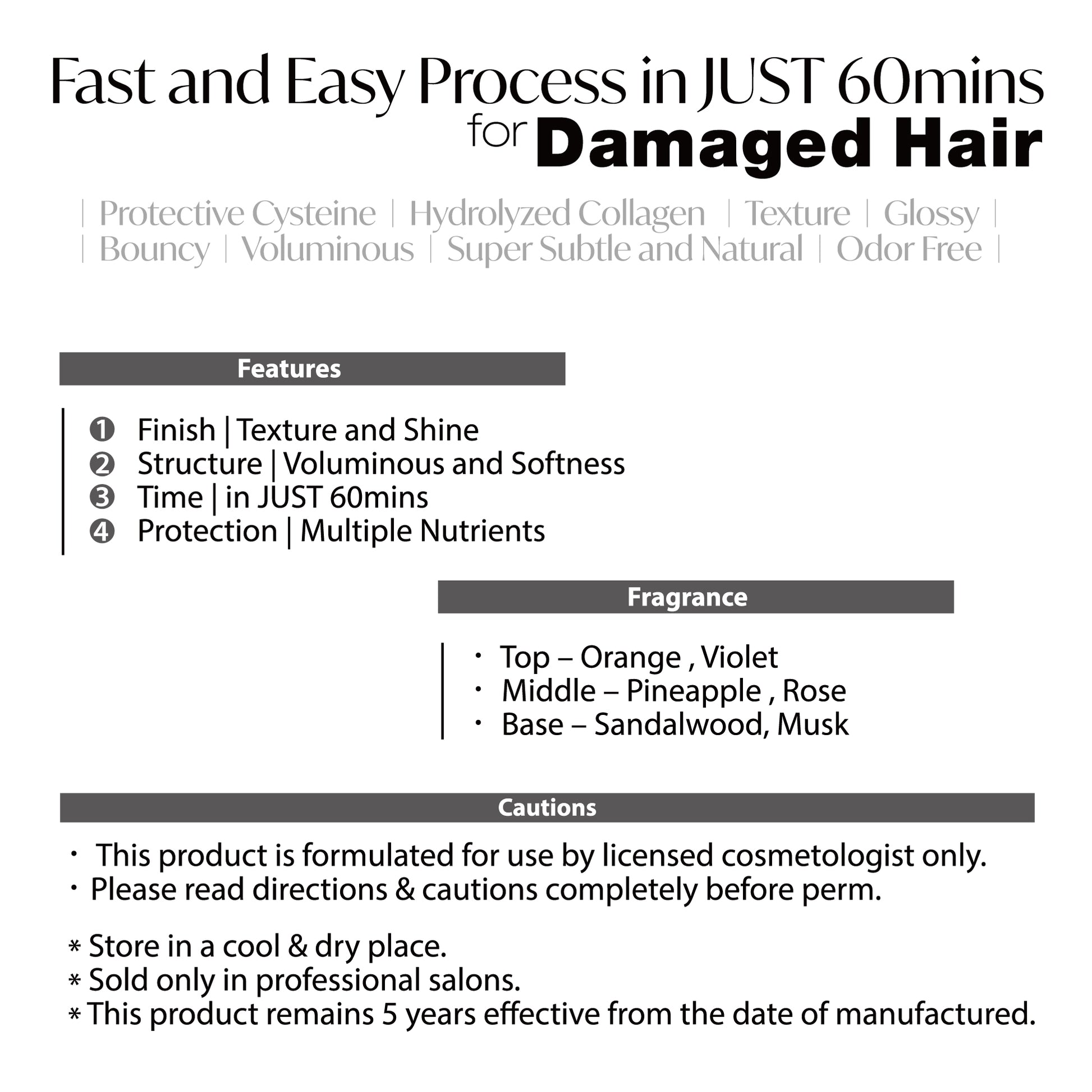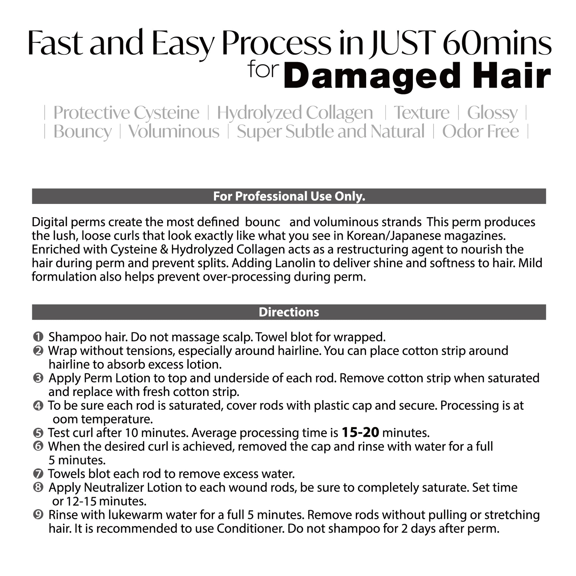 富含半胱胺酸和水解膠原蛋白,可在燙髮過程中滋養秀髮,防止分叉,並起到重塑髮質的作用。加入羊毛脂,讓秀髮光澤柔順。溫和配方也有助於防止燙髮過程中過度損傷。