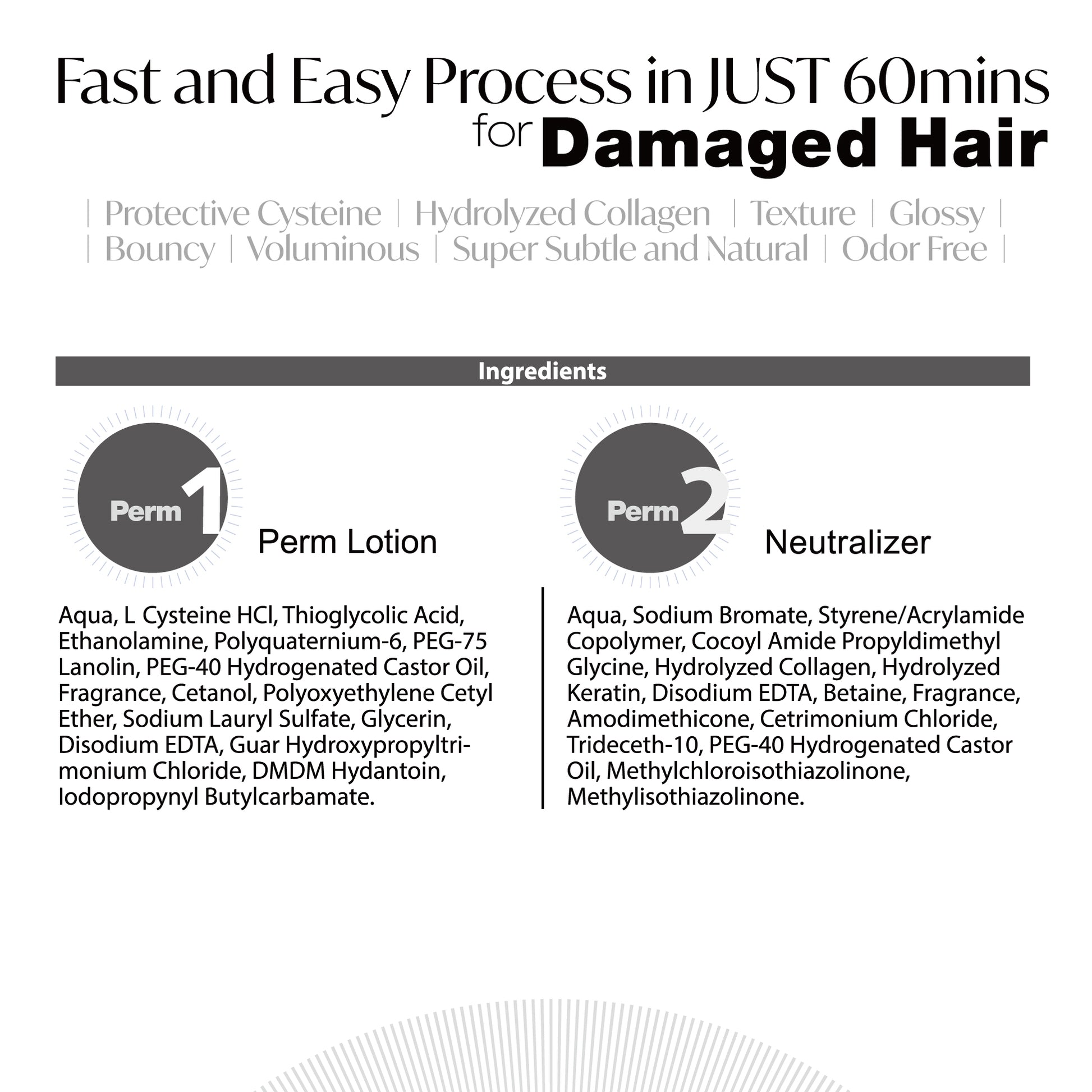 水、L-半胱胺酸鹽酸鹽、巰基乙酸、乙醇胺、聚季銨鹽-6、PEG-75羊毛脂、PEG-40氫化蓖麻油、香精、鯨蠟醇、聚氧乙烯鯨蠟基醚、月桂醇硫酸鈉、甘油、乙二胺四甲鈉、瓜爾膠羥丙基三甲基銨銨、DMDM乙內醯基烷炔、碘丙基三甲基銨酸酯。